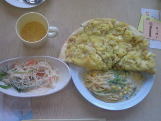 私が食べたのはパスタとピザのセット。すごいボリュームでしょ?お腹いっぱいです♪